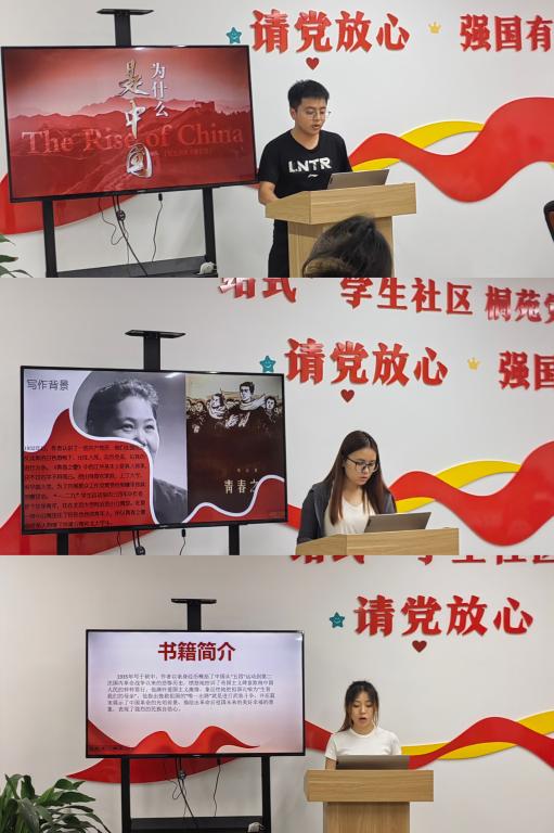 分享活动中,4名学生依次从所读书目的内容介绍、作品鉴赏以及读书感悟等方面分享了《为什么是中国》、《青春之歌》、《保卫延安》和《红岩》等书籍,他们从不同的角度立意,结合个人阅读感悟,生动讲解了这些优秀作品的创作背景、精彩内容和深刻寓意,将自己的人生感悟和学生干部经验融入分享之中,引发了大家的共鸣和思考。活动现场氛围轻松活泼,感情表达真挚,激发了与会人员的学习热情,拓宽了大家的知识视野,提升了青年学生的政治理论水平和素养。