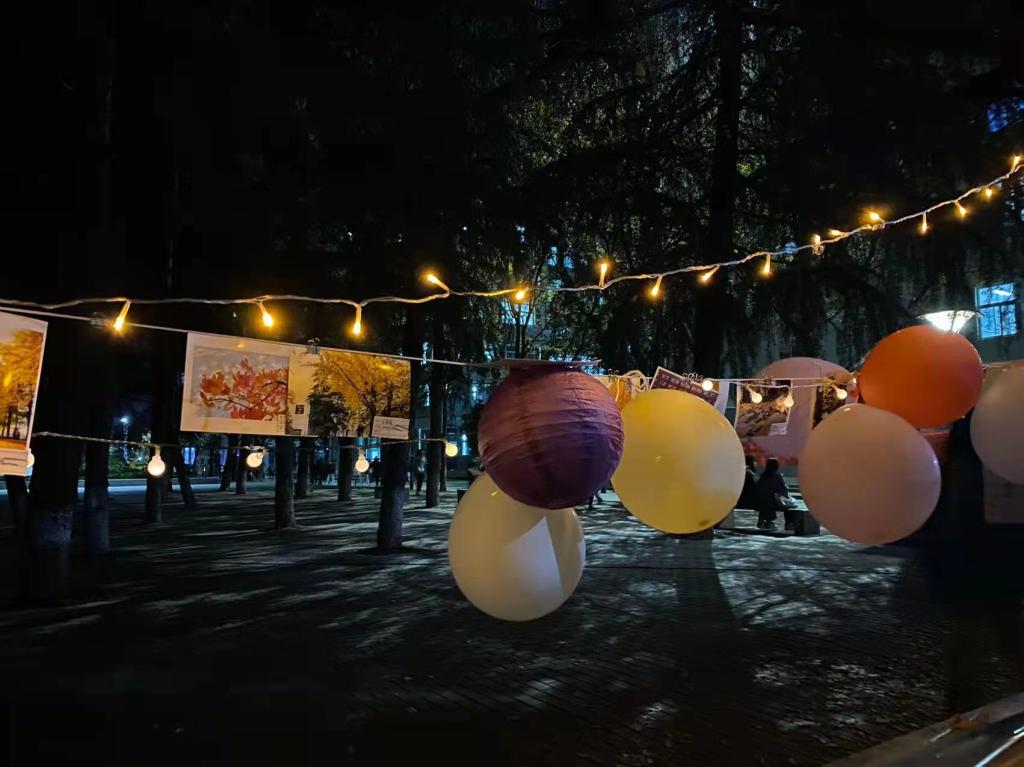 秋风起,银杏落。明德芳菲路笼罩在一片金色之中,在碧蓝的天空下,银杏叶伴随着微风起舞。经过前期精心筹备,本届银杏艺术节在芳菲路展示了书法、绘画、摄影等作品,还展示了学生们以银杏叶为材料制作的手工文创作品等,同时为前来参加活动的师生提供了品尝银杏茶的服务。除了作品展示外,活动还得到学校其他社团的大力支持,他们带来了异彩纷呈的节目和表演。主要有中国传统文化社带来的茶艺与古筝表演,让现场的师生们一同感受中国传统文化的魅力;汉服社团带来的服饰文化展示,给现场师生呈现了一场视觉盛宴;大学生艺术团的爱好者们送来了精彩的乐队演出;学院学生会的同学们带来的自编舞蹈与歌曲串烧;在耿露老师的带领下,现场的同学们齐唱了《我和我的祖国》,激发了同学们的爱国之情,将活动推向高潮,歌声在明德夜空久久回荡。
