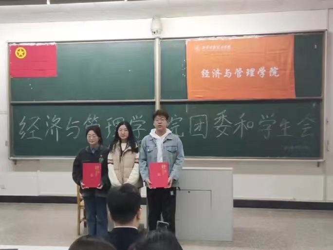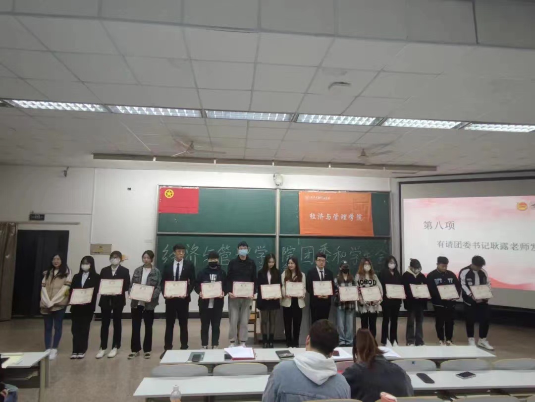 会议第九项,由团委书记耿露老师为第四届经济与管理学院团委和学生会负责人发放聘书,感谢其一年的辛苦付出。