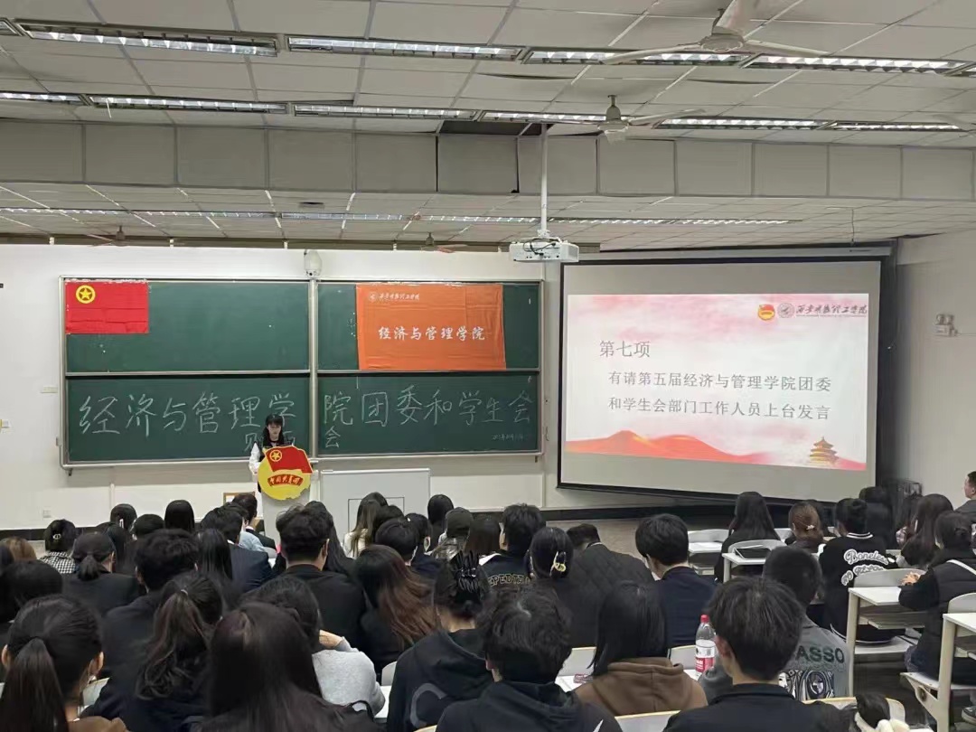 会议第六项、第七项,第五届部门负责人代表、部门工作人员发言,表明未来将会认真工作,充分发挥团学干部的模范带头作用,将经济与管理学院团委和学生会越办越好。