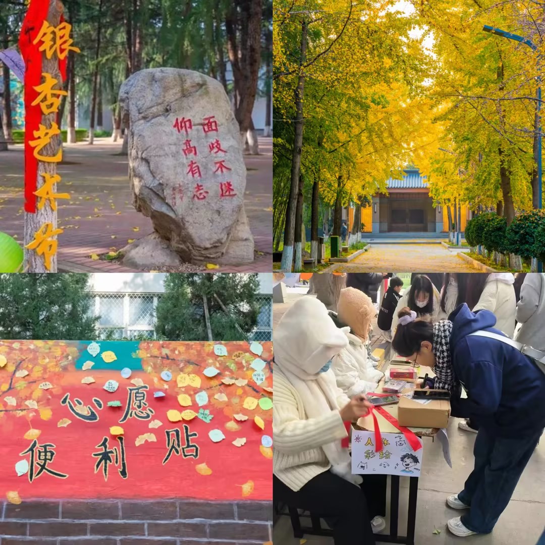 虽然寒风凛冽,但同学们热情依旧。秋风肃起,大雁南飞,同学们在银杏墙上留下美好的寄语,把思念化作银杏,轻轻地落在了芳菲路上,银杏开启了一年中最华丽的篇章,更加光彩照人。