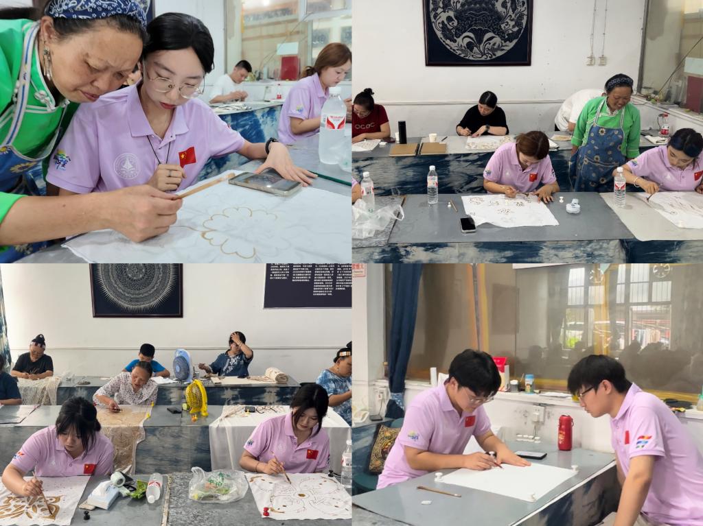 为深入了解蜡染在当地的产业发展情况,学习蜡染制作工艺,实践队前往丹寨县宁航蜡染工坊学习交流。在讲解员的带领下,队员们参观了蜡染制作,从绘制图案、融蜡、点蜡、浸染、脱蜡到最后成品的全部流程,了解到蜡染的起源和窝妥纹、蝴蝶图、百鸟图等代表性图纹所蕴含的民族文化,蜡染传承人对民族文化的热爱和坚持更加激发了队员们自觉弘扬传承中华优秀传统文化的热情。