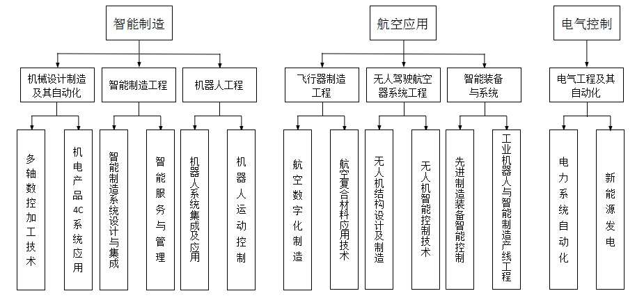 学院下设智能制造、电气控制 航空应用三大专业群包含机械设计制造及其自动化、飞行器制造工程、电气工程及其自动化、智能制造工程、机器人工程、无人驾驶航空器系统工程和智能装备与系统等7个专业。其中机械设计制造及其自动化、飞行器制造工程是陕西省一流本科专业建设点电气工程及其自动化专业级一流本科专业