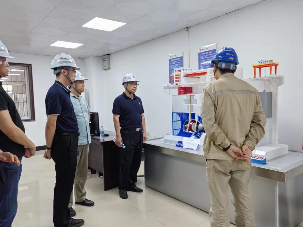 首先,在汉江公司党委委员、副总经理、蜀河水力发电厂党支部书记、厂长董宁的陪同下,世界杯官网人员参观了水电厂的发电机层、水轮机层、泄洪闸门、中控室和水电机组模拟操作培训室,了解了并网发电、贯流式机组运维、电力智慧调度等情况。