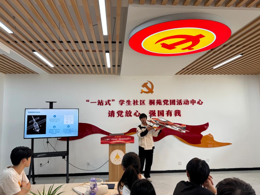 活动伊始,校航模队负责人2019级学生刘悦奔讲解了航模的飞行原理、设计构造以及在制作和操控过程中所涉及的专业知识,让同学们对航空领域有了更直观的认识,也激发了大家对专业学习的浓厚兴趣。无人驾驶航空器系统工程专业专职教师韦纪州从我国航空事业的今昔对比为切入点,勉励学生要在今后的学习和生活中,时刻牢记党员的责任与使命,以习近平新时代中国特色社会主义思想为指引,将爱国精神转化为学习动力,努力提升专业素养。