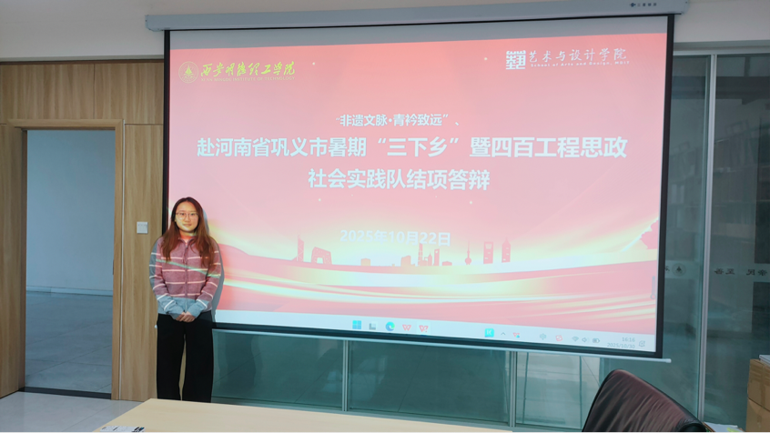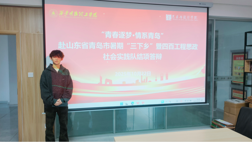 答辩过程中,各实践队以PPT汇报形式,从实践背景、调研过程、成果产出、思政感悟等方面展开阐述,生动呈现了实践中的探索与收获。其中,像“啡遗文脉·青衿致远”赴河南省巩义市实践队,深挖当地非遗文化与咖啡产业的融合点,以设计赋能传统文化传播;“育见偃师·艺路同行”赴河南省偃师市实践队,结合专业特长开展美育帮扶与文化调研,用艺术点亮乡村教育;“青春逐梦·情系青岛”赴山东省青岛市实践队,聚焦城市文旅与海洋文化,通过创意设计为地方发展注入青春活力。20支团队紧扣“四百工程”思政教育要求,将专业所学与基层需求深度融合。