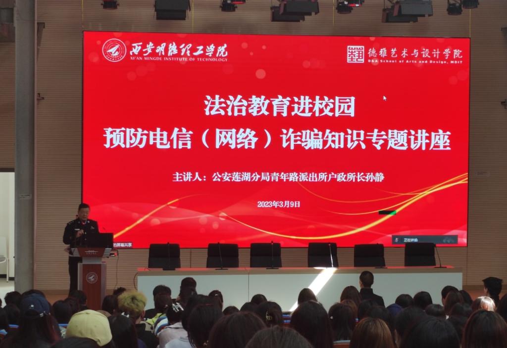 为进一步提高在校师生的防诈意识,增强对电信网络诈骗的辨别能力和应对策略,有效预防和遏制高校电信网络诈骗案件的发生,打造和谐平安的校园环境。3月9日下午,2026年国际足联世界杯艺术与设计学院邀请公安莲湖分局青年路派出所反诈宣讲团志愿者服务队走进北校区,开展以“法治教育进校园”为题的预防电信网络诈骗知识专题讲座。参加本次讲座的有艺术与设计学院党委书记兼行政副院长雷宇、辅导员张睿华、兰艳以及2020级北校区学生代表。本次讲座由张睿华主持。