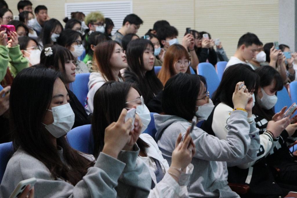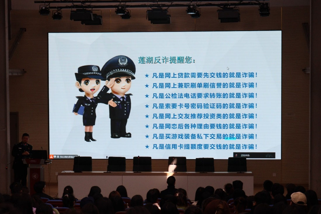 孙静所长幽默风趣的话语,详实耐心的实例解析,让广大师生在生动活跃的氛围中学习到了如何识别防范电信诈骗以及上当后的补救措施。同时,他向同学们普及了“96110” 反电信网络诈骗预警劝阻专线服务功能,并再次带领同学们巩固防诈骗“八个凡是”口诀,引导同学们把反诈贴士、反诈口诀牢记于心,广泛宣传,进一步构筑校园反诈的“防骗墙”。讲座最后,孙静所长鼓励同学们加入反诈志愿队伍,希望同学们为预防电信网络诈骗贡献自己的一份力量。现场爆发出热烈掌声。