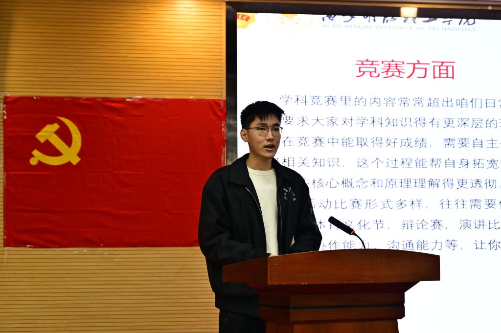 学生党员董志博带来“竞赛活动竞锋芒青春历练绽华光”的分享。他详细介绍了参与各类学科竞赛和自己校园活动的经历,讲述了竞赛可以使我们更好的学习知识,更全面的提升自我。他还结合自身经历给出了参加校园活动的建议,鼓励大家积极投身竞赛当中投身于校园活动当中,绽放青春光彩。