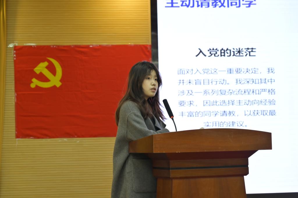学生党员慕中蓓围绕“学习内容的深度增值”,深入剖析了如何对所学知识进行深度挖掘与拓展。她认为学习不能仅满足于课堂上老师所传授的基础知识,还要主动探索知识背后的原理,通过阅读专业书籍、参与学术讨论等方式,实现知识的“增值”,从而构建起更为完善、扎实的知识体系,引发了同学们对于深度学习的深入思考。