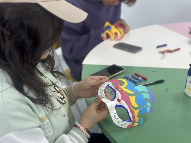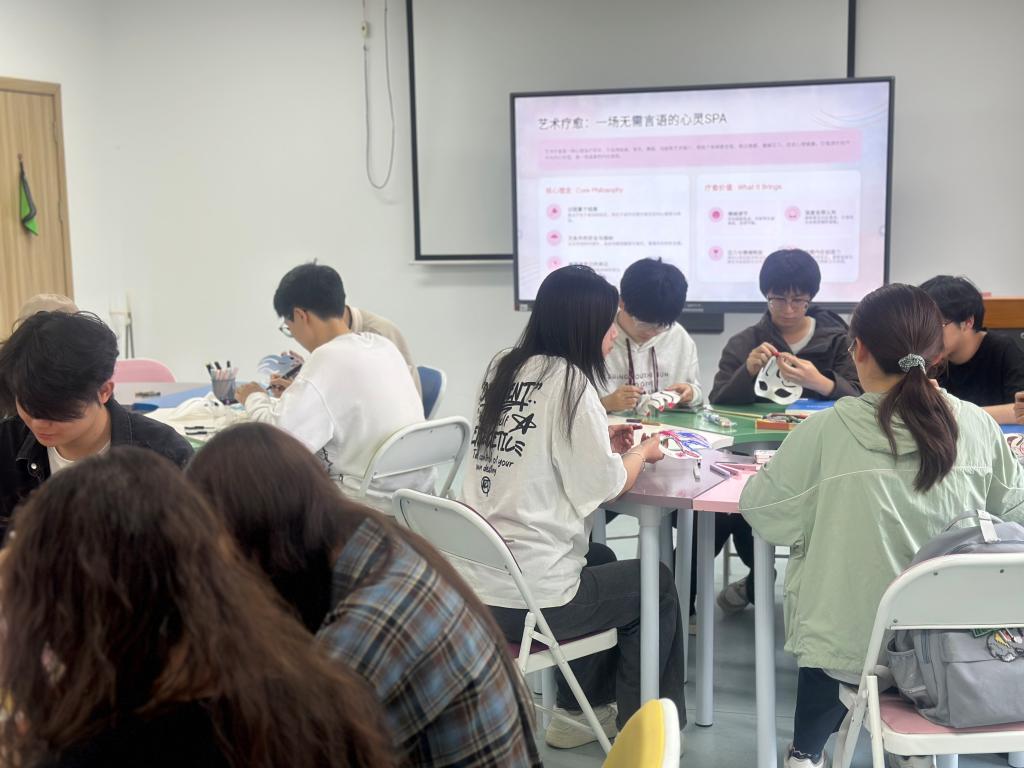 闫梦娜老师结合“3.25善爱我,5.25我爱我”的心理育人宣传季理念,鼓励大家在艺术创作中放松身心、觉察情绪,用美的方式滋养心灵。曹源老师带领学生围绕特定主题进行面具涂鸦创作,同学们拿起画笔,在空白面具上自由涂鸦、尽情表达。有的用明亮的色彩传递积极情绪,有的用抽象的图案诉说内心故事。整个创作过程安静而专注,现场氛围温馨融洽,艺术与心灵在画笔间悄然对话。