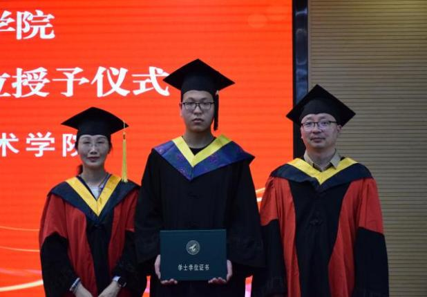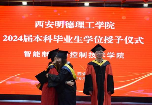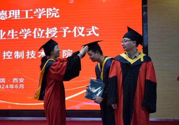 学位授予仪式上,毕业生分别上台鞠躬谢恩,朱延波副校长、殷锐院长、李建勇副院长与学子握手祝贺,并为毕业生拨穗正冠并授予学位证书。