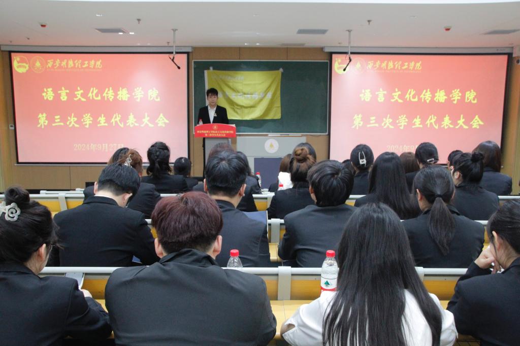9月27日,语言文化传播学院第三次学生代表大会在建德楼201报告厅顺利召开。学校团委副书记刘雄、学院党委副书记杨峰、团委书记周清岚、学院办公室主任范亚苗、信息工程学院团委书记王佳龙、经济与管理学院团委书记卢保全、智能制造与控制技术学院张兴、校学生会主席团代表薛东浩、学院全体辅导员以及全体学生代表出席本次会议。本次大会由语言文化传播学院学生闫可可主持。