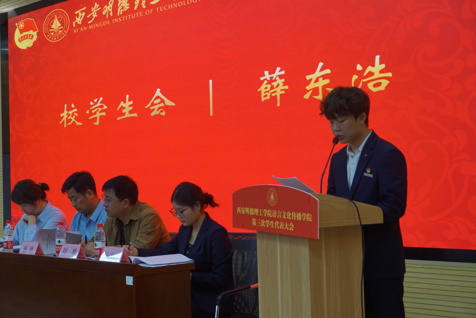 随后,校学生会代表薛东浩致辞,他对语言文化传播学院第三次学生代表大会的召开表示热烈的祝贺,并对我院上一年的学生工作给予了肯定,同时对学生会工作做出指导,并提出了对未来工作的期望。