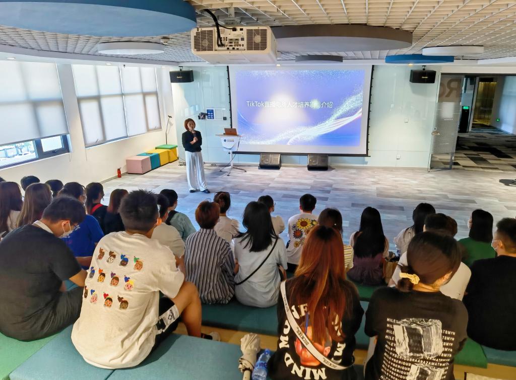参观结束后,TikTok主播培训老师田羽孜在报告厅向同学们讲解了公司关于TikTok直播电商人才培养方案,详细深入讲述了短视频的发展历程,并针对英语专业学生重点介绍了公司海外直播的发展规划、运营管理和人才需求。最后杨经理表示希望通过此次学习交流能够让同学们更加深入了解海外直播文化和运营模式,真诚欢迎同学们来易点天下工作实习。