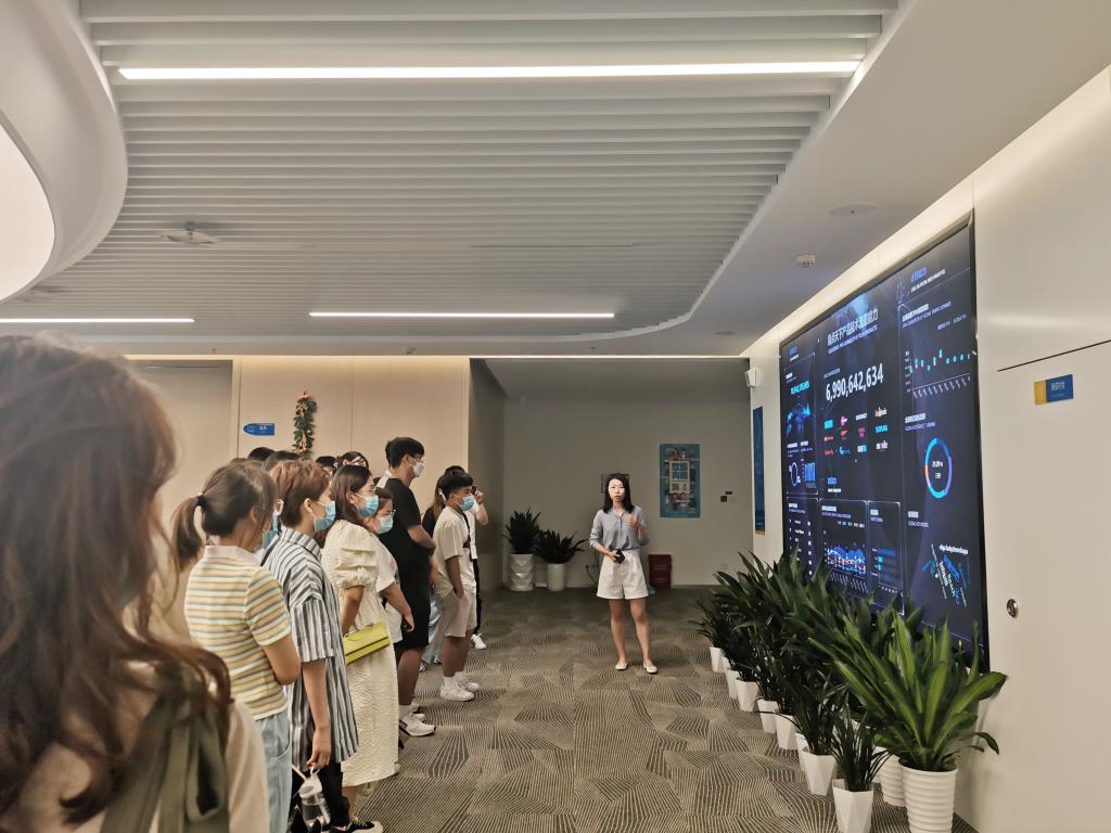 首先,杨佳向同学们详细介绍了公司的企业文化、商务板块和发展规划等内容,并带领学生们参观了公司的办公区域、直播间等。井然有序的办公场所、干净整洁的办公环境以及温馨友爱的企业文化给同学们留下了深刻的印象。参观期间,同学们表现出了极大的好奇心和学习热情,主动提问并表达自己的想法感受,杨佳也不厌其烦地一一解答,并与同学们进行了深入交流。