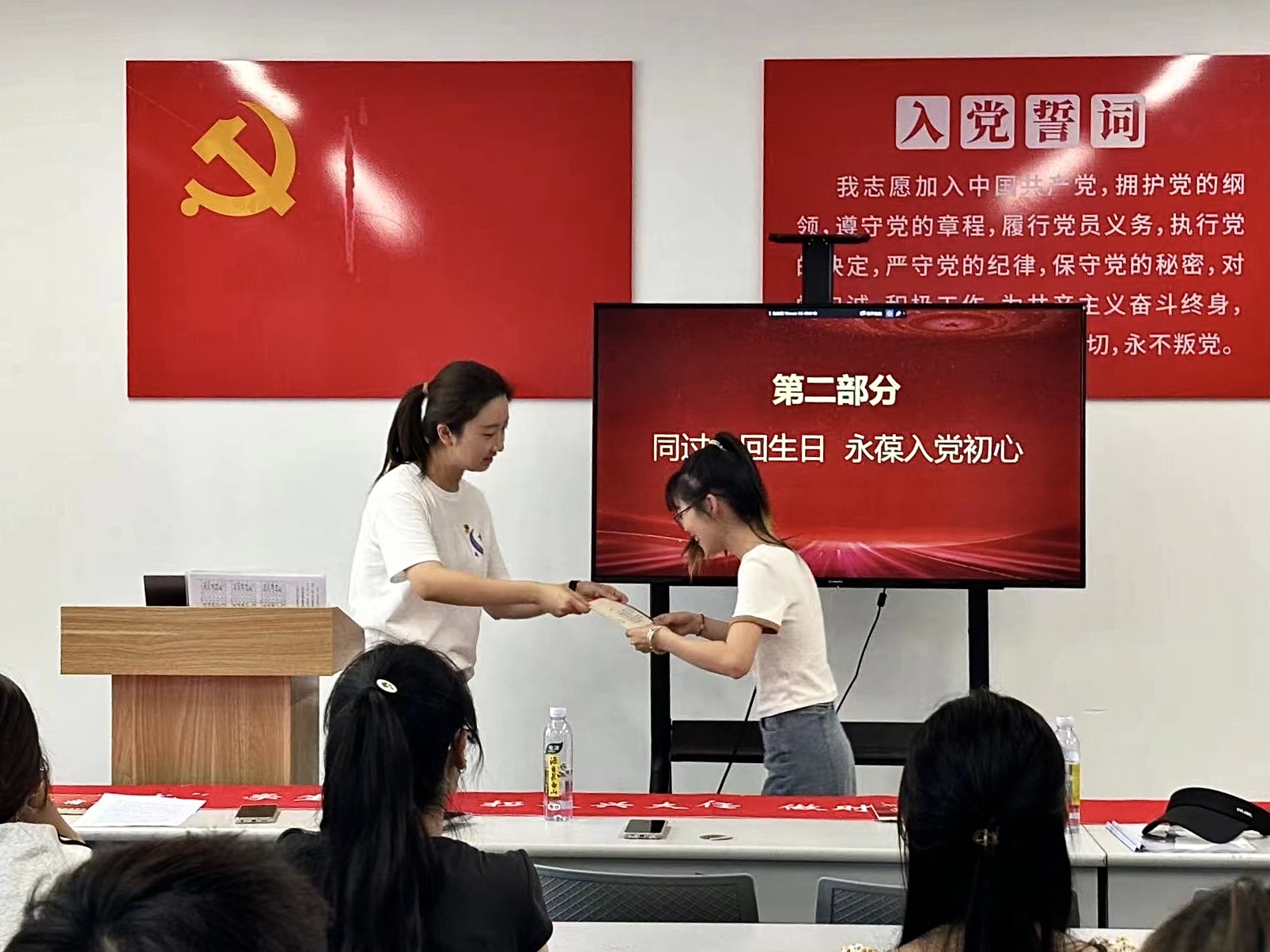 作为一名党员,正式入党的那一天是神圣且难以忘怀的。而“政治生日”这一特别的纪念方式,不仅是对自己政治身份的肯定,更是对党的忠诚和信仰的再次承诺。学生第二党支部书记侯澄为毕业生党员同志颁发政治生日卡片,她鼓励党员们时刻牢记身份意识,严守党的纪律,永葆入党初心,坚定履职尽责,充分发挥党员的先锋模范作用。