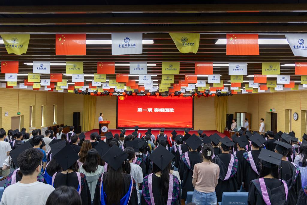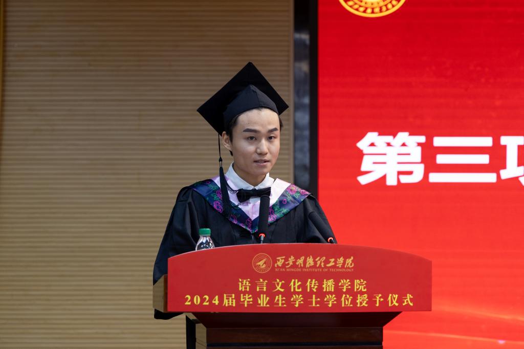 优秀毕业生代表陈立捷饱含深情地分享了在大学阶段的成长感悟,同时表达了对母校悉心培育、师长谆谆教导、同窗浓厚情谊的不舍与感恩之情。他表示要用在校所学的知识和行动准则去创造更多的价值,怀着国之大者的胸襟,肩负起小我融入大我的担当,带着学校与老师的殷切期待,用最骄傲的姿态最自信的笑容走向五湖四海,披荆斩棘,勇往直前。