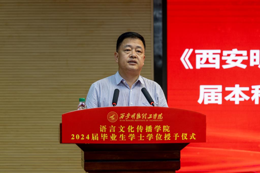 在师生的热烈掌声中,院长马庆林代表学院致辞,向全体毕业生表达了最热烈的祝贺和最真挚的祝福。他表示,寒来暑往、春华秋实,同学们在学院用热爱点燃梦想、用奋斗谱写青春华章,拨节孕穗、蜕变成长。他希望语传学子面对未来要胸怀壮志,以远大的理想引领人生航向;要脚踏实地,以扎实的学识牢筑事业基础;要勇于创新,以开放的心态拥抱风云变化;要锐意进取,以不懈的努力追求卓尔不凡。