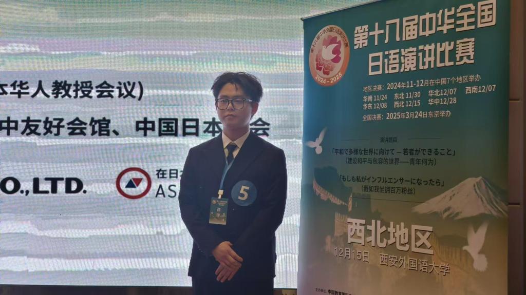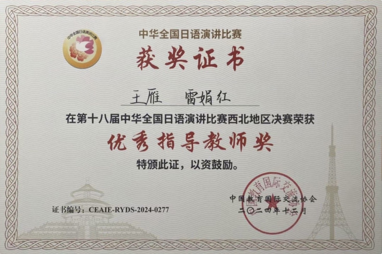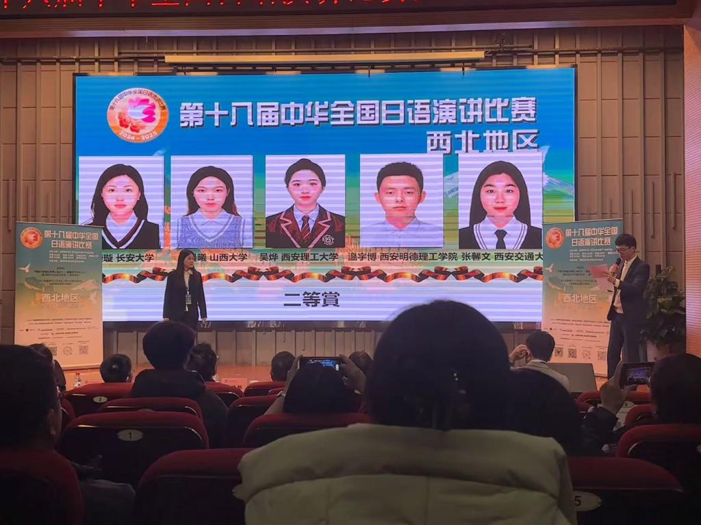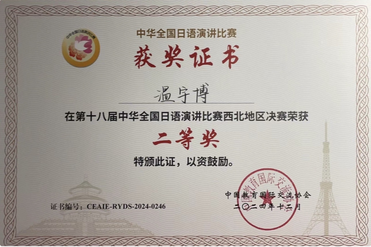 2024年12月15日,第十八届中华全国日语演讲比赛西北地区决赛在西安外国语大学隆重举行。我院日语专业2022级温宇博同学凭借优异的表现,在西北地区各高校选派的28名参赛选手中荣获二等奖,实际位次为7/28。王雁和雷娟红老师获得优秀指导教师奖。