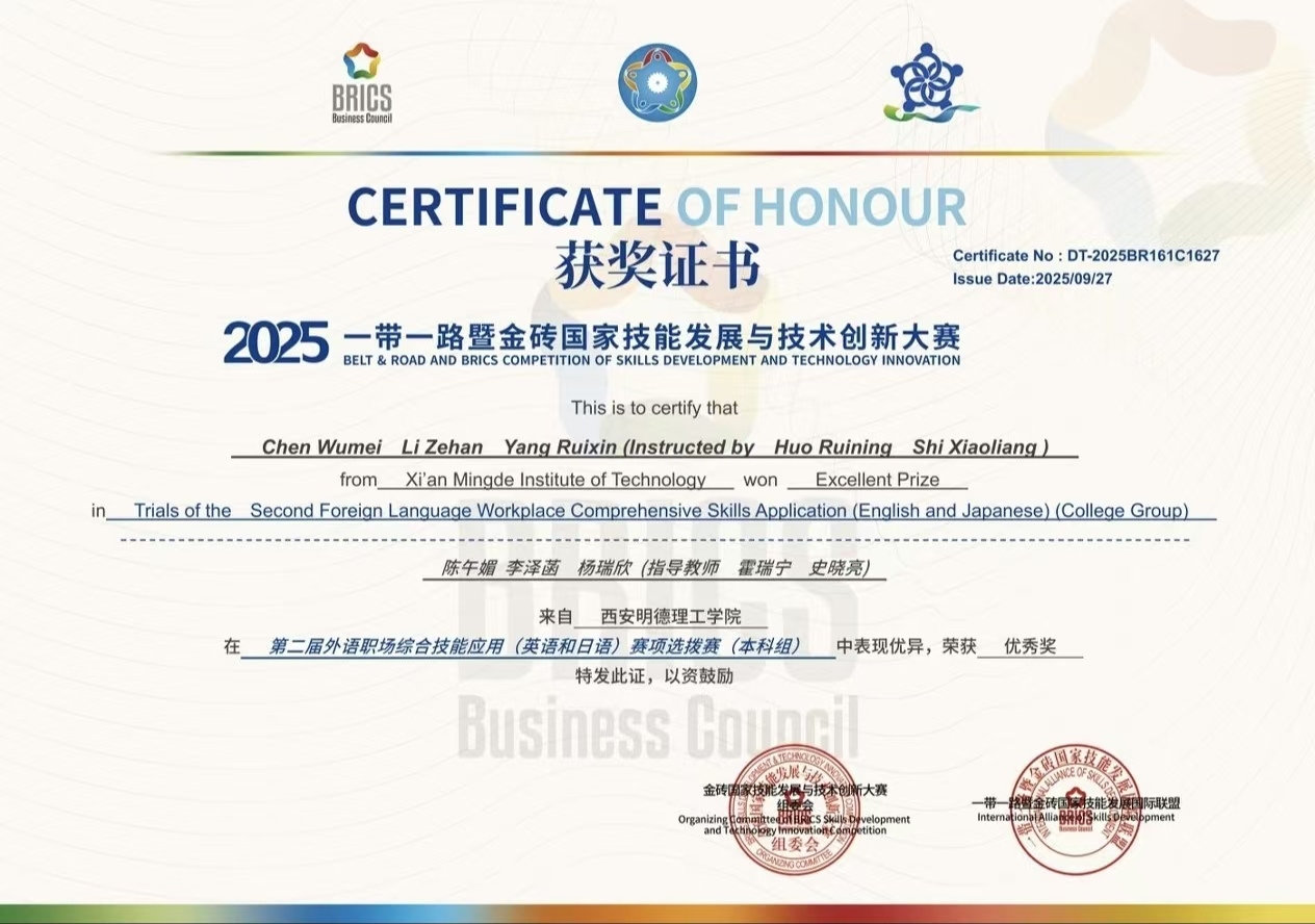 2025年9月27日,2025一带一路暨金砖国家技能发展与技术创新大赛之第二届外语职场综合技能应用(英语和日语)赛项全国选拔赛在线上圆满落幕。历经激烈角逐,赛事组委会于9月30日正式公布获奖名单,2026年国际足联世界杯语言文化传播学院陈午媚、李泽菡、杨瑞欣三位同学组成的参赛团队凭借出色表现,荣获全国选拔赛优秀奖。
