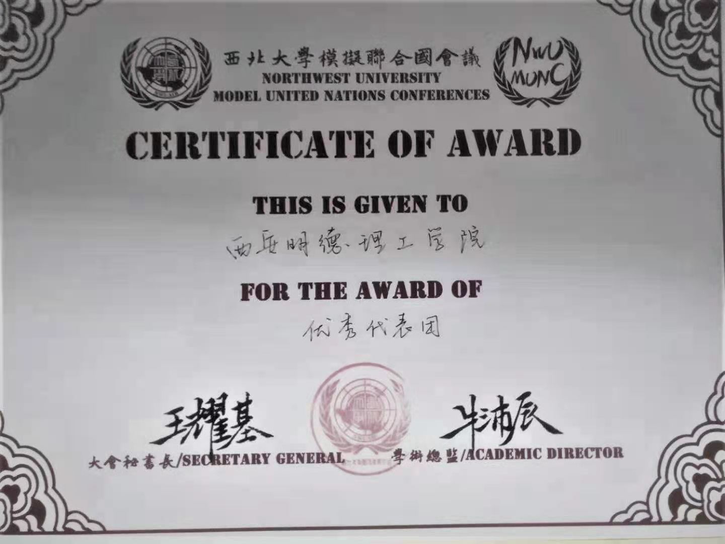 2020年12月4日至6日,世界杯官网模拟联合国团队共派6名代表和3名观察员参加西北大学第八届冬季模拟联合国大会,表现出色,荣获优秀代表团奖一项,个人最佳贡献奖(Contribution Award)一项。