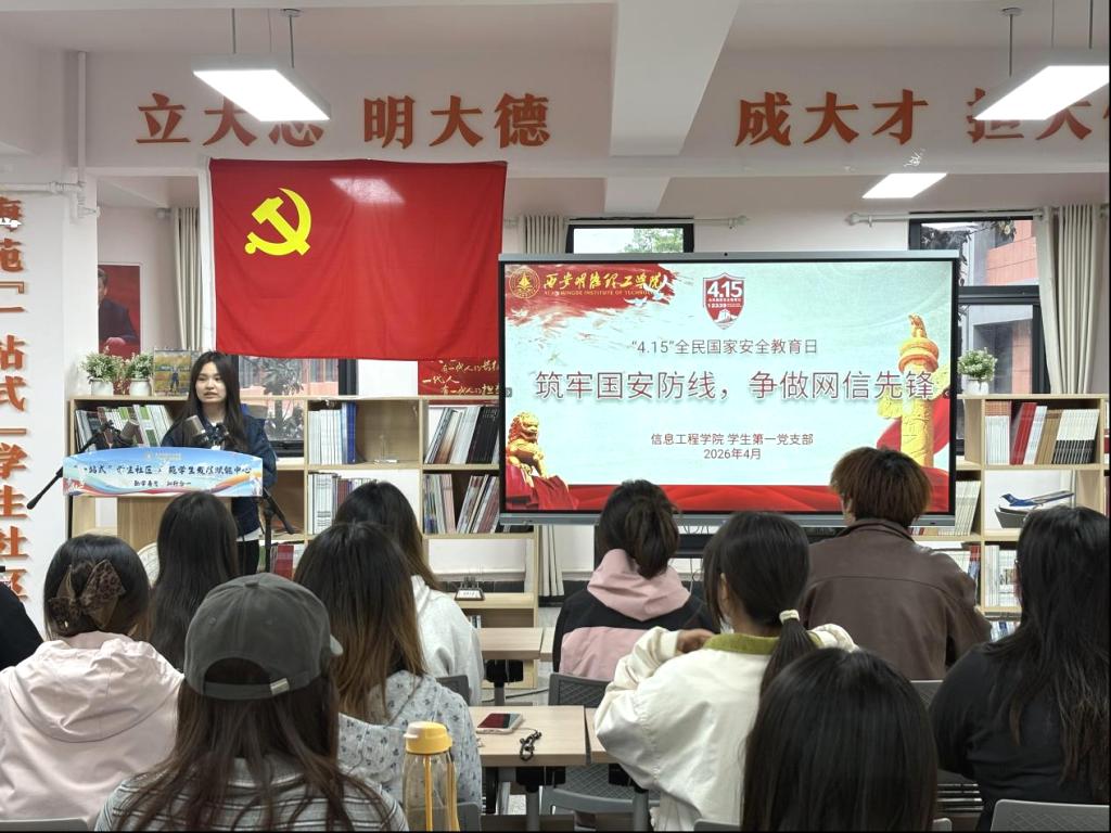 为深入学习贯彻总体国家安全观,强化青年学生党员国家安全意识、网络安全素养与责任担当。4月13日,信息工程学院学生第一党支部紧扣“统筹发展和安全、护航‘十五五’新征程”主题,在“一站式”学生社区梅苑学生发展赋能中心,开展“筑牢国安防线,争做网信先锋”全民国家安全教育日主题党日活动。活动由党支部书记张蓉主持,支部全体党员、发展对象共同参与。