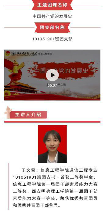 “党旗所指,便是团旗所向。”喜迎建党一百周年,我院团工委积极开展党史学习教育研讨,重温党、团的初心使命;疫情期间,弘扬抗疫精神,并在我院微信公众号——明德信工,开设“不忘初心、牢记使命”专栏,激发学生爱国热情。开展青年团干讲党史系列微团课的活动,推动青年大学生共同参与党史学习教育,进而坚定理想信念,凝聚奋进动力,努力在现代化新征程中放飞青春梦想。在团中央青年大学习的学习过程中,我院按照团省委要求,以“团干部领学、老师督学、团员青年跟学”为核心,采用“日督促、周排名”的方式,落实我院相关工作的开展,营造浓厚学习氛围,号召全体团学干部做有时代感、使命感的大学生。