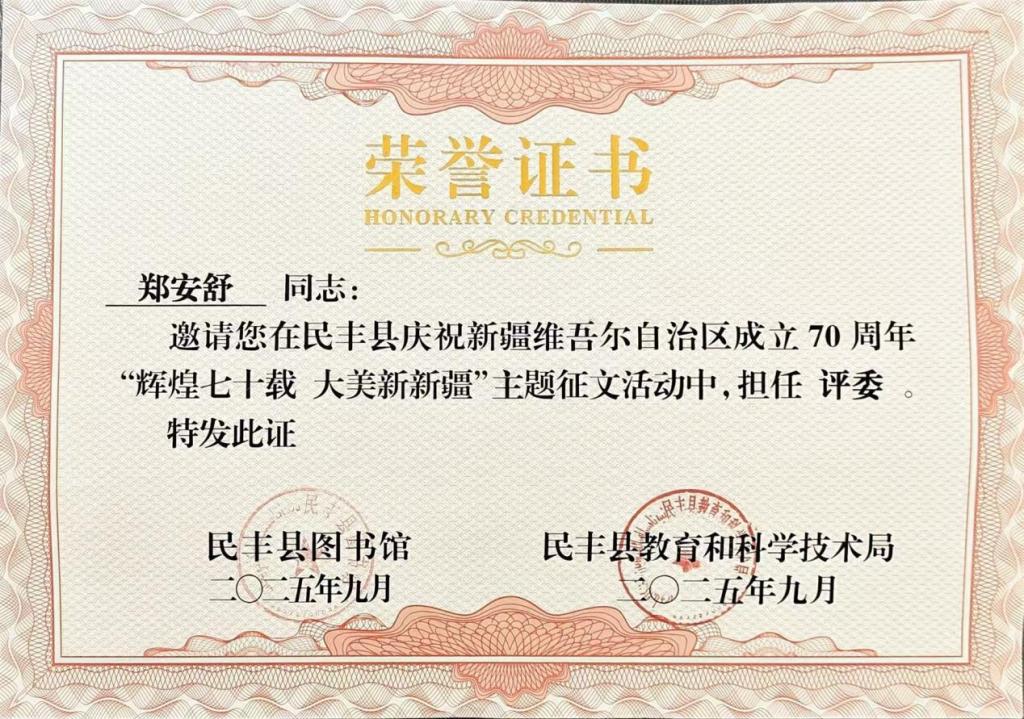 2025年9月,在民丰县庆祝新疆维吾尔自治区成立70周年“辉煌七十载 大美新新疆”主题征文活动中担任“评委”。