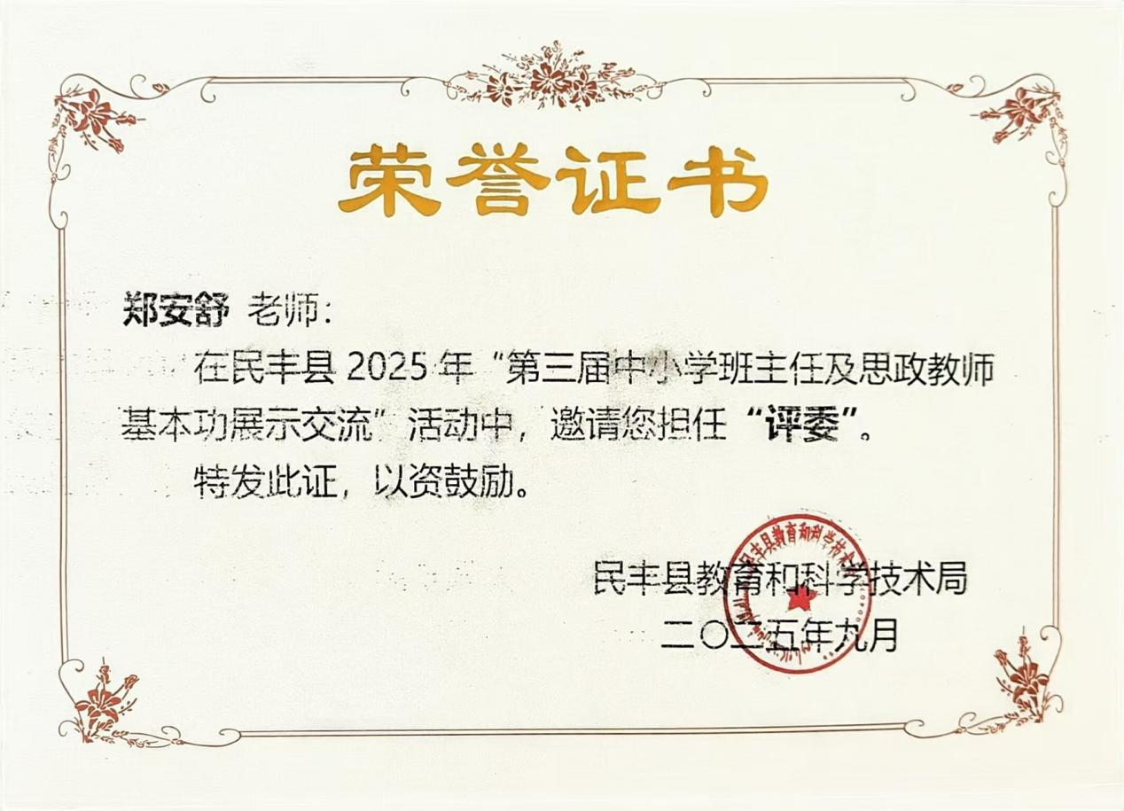 2025年9月,在民丰县2025年“第三届中小学班主任及思政教师基本功展示交流”活动中担任“评委”。