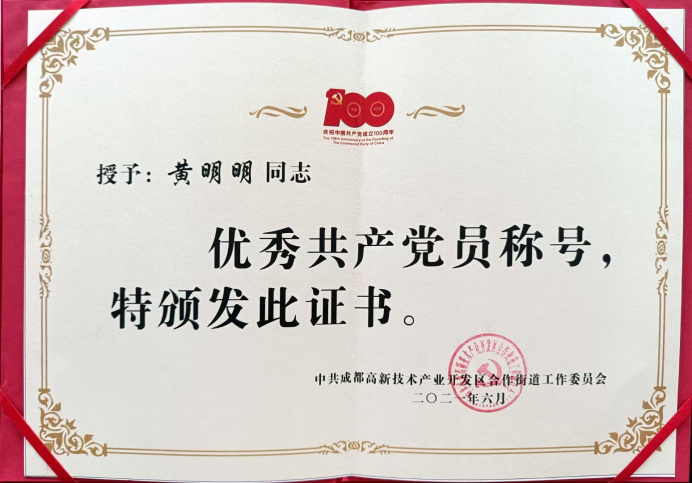 2021年,获得成都市高新区合作街道,“优秀共产党员称号”。