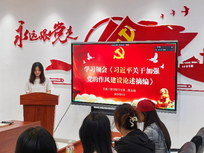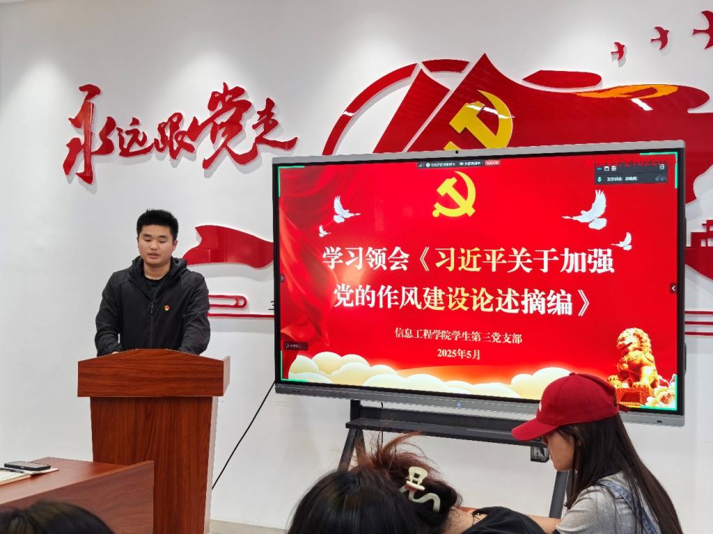 为持续推动深入贯彻中央八项规定精神学习教育走深走实,进一步加强支部作风建设,提升学生党员的思想认识和行动自觉。5月28日下午,信息工程学院学生第三党支部在明志楼北108党群服务中心开展专题学习研讨活动,专题学习《习近平关于加强党的作风建设论述摘编》相关内容。此次会议由支部书记李娜主持,全体党员、发展对象共同参与。