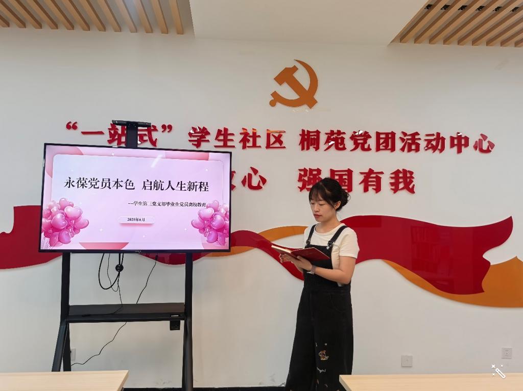 为进一步加强毕业生党员纪律意识与党性修养,引导毕业生党员文明离校、筑牢思想根基,永葆政治本色,6月9日晚18:30,学生第三党支部在“一站式”学生社区桐苑党团活动中心开展毕业生党员离校教育主题党日活动,活动由支部书记李娜主持,支部全体毕业生党员参加。