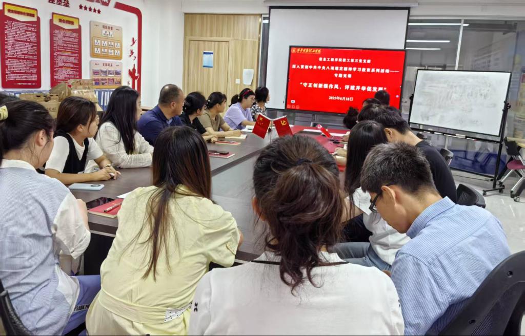 2025年6月18日,信息工程学院教工第三党支部成功举办了一场以“守正创新强作风,评建并举促发展”为主题的党课,由党支部书记李颖华同志主讲,旨在通过深入学习中央八项规定精神,结合高校教师本职工作和学校评建工作,进一步强化作风建设,推动学校评建工作取得新成效。