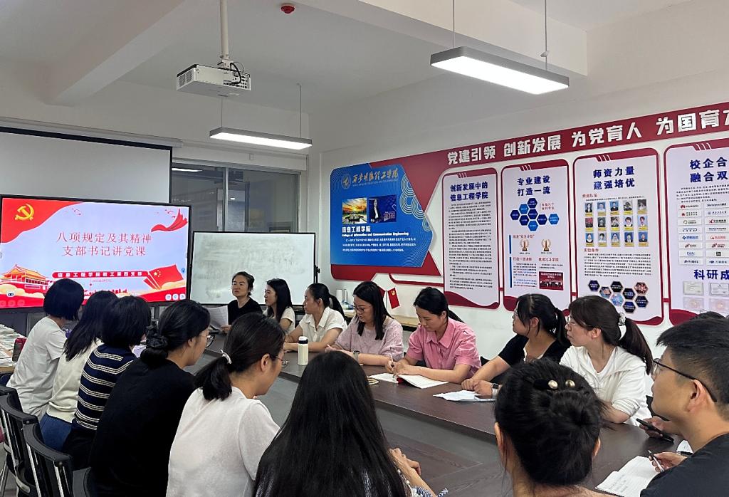 6月17日,信息工程学院教工第四党支部召开专题党课学习会,深入学习中央八项规定精神及习近平总书记关于作风建设重要论述,引导全体党员筑牢纪律意识,以过硬作风凝聚奋进力量。