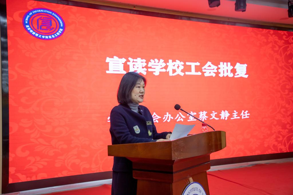 大会在庄严的国歌声中正式拉开序幕。校工会办公室主任蔡文静宣读了校工会《关于信息工程学院工会召开工会会员大会的批复》。