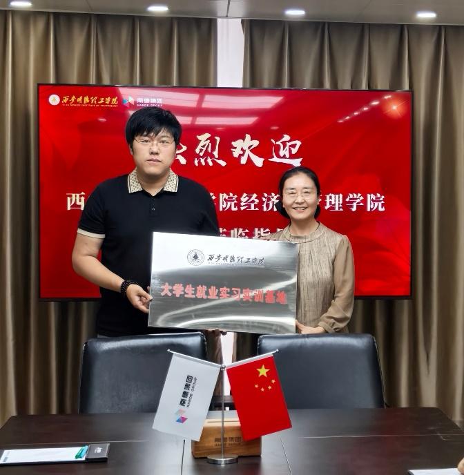 刘敏代表学院向企业授牌大学生就业实习基地,郭平南代表企业方向学院授牌产学研合作基地。