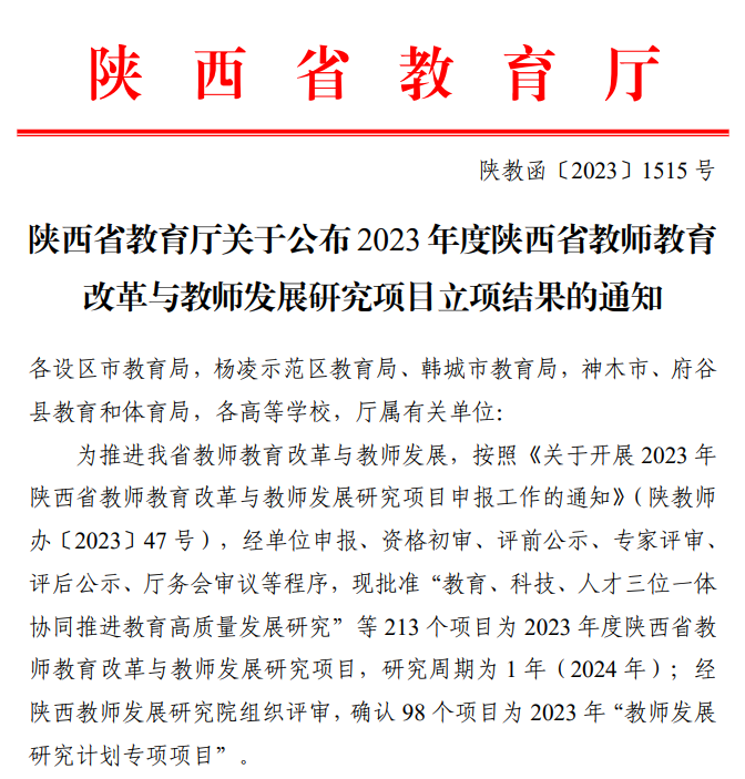 陕西省教师教育改革与教师发展研究项目是省教育厅落实中央和省委新时代教师队伍建设改革精神,提升教师教育改革和教师发展理论与实践研究水平的重要措施。学校高度重视项目申报工作,经过个人申报、学校评审后,报送教育厅,确保选送项目的高质量和竞争力。
