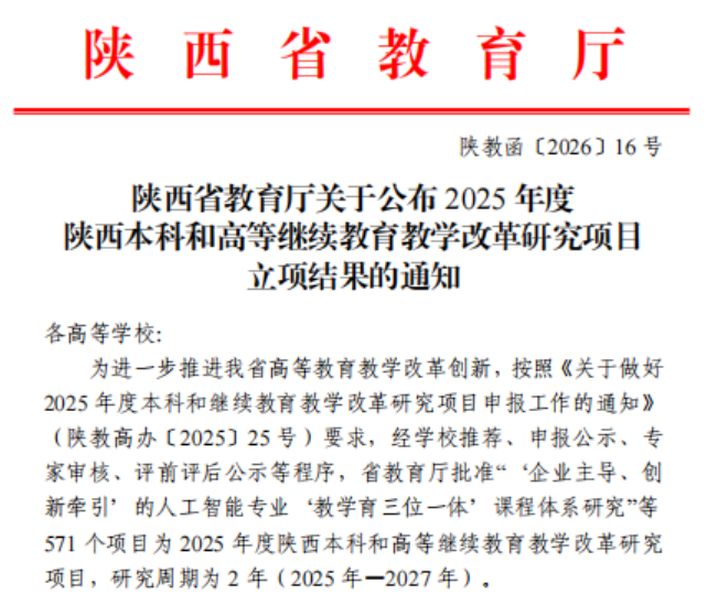 近日,陕西省教育厅正式公布了《关于2025年度陕西本科和高等继续教育教学改革研究项目立项结果的通知(陕教函〔2026〕16号),学院市场营销专业教师延璐申报的《经管类专业“AI交互情境赋能五阶能力递进”专创融合模式研究与实践》项目,经学校推荐、专家评审、省教育厅审核,成功获得立项。