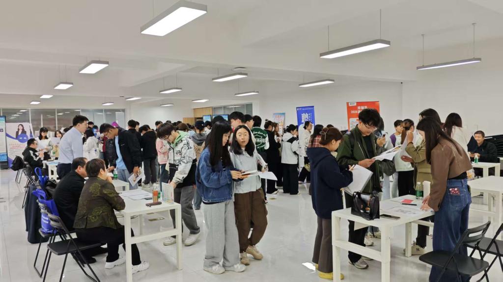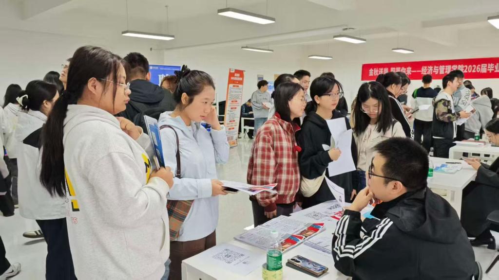 为搭建企业与毕业生交流互动的平台,助力毕业生充分高质量就业,10月14日,经济与管理学院在明志楼南411举办2026届毕业生专场招聘会。开源证券、广州知贤道远信息服务有限公司西安分公司、陕西华创企业集团有限公司、陕西亿杰金赋信息科技有限公司、联储证券、西安金福昌财务管理有限公司、陕西同鑫财税策划管理有限公司、陕西宝旭数智科技有限公司、陕西泾航企业管理集团有限公司、正和信企业管理中心有限公司、陕西润生财务集团有限公司等12家单位参会,涵盖金融、财会、营销、教育培训等行业,提供岗位60余个,经济与管理学院2026届毕业生参加了招聘会。