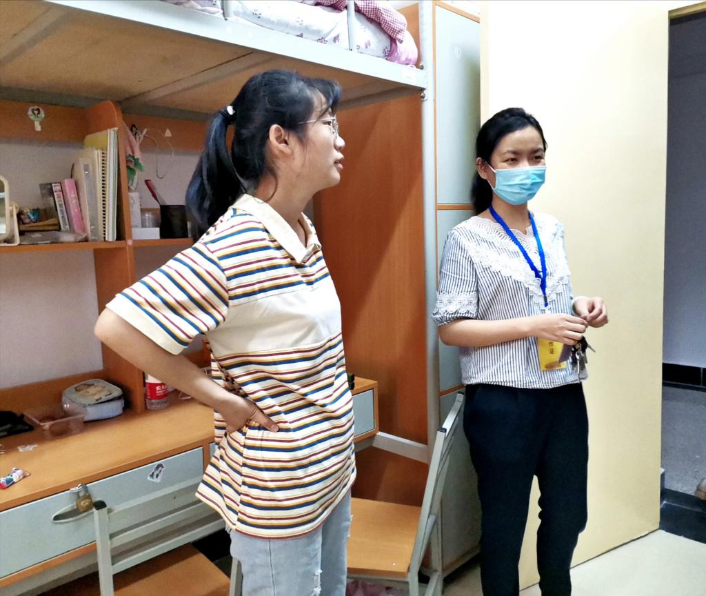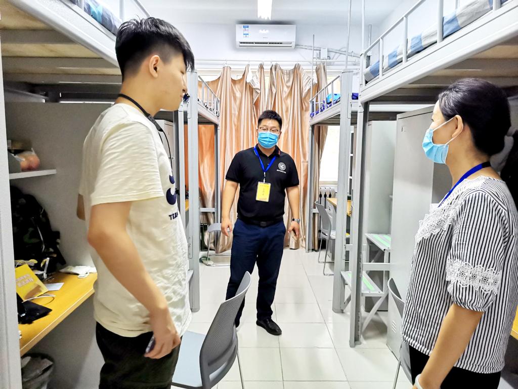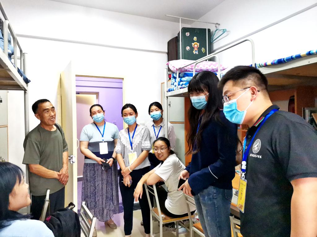 在新生宿舍,学院领导及老师对新同学的到来表示欢迎。对新生的住宿情况进一步查看,确保入住寝室设施完好;对新生未来大学生活计划进行简单询问,希望新同学可以珍惜大学四年时光;同时,提醒同学做好网络安全防护工作。