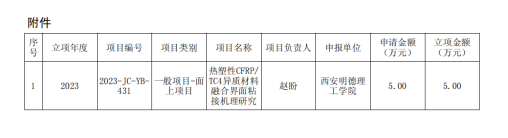 近日陕西省科技厅公布了2023年度陕西省科技计划项目立项结果,我院赵盼博士申报的《热塑性CFRP/TC4异质材料融合界面粘接机理研究》项目获得2023年度陕西省科技计划项目一般项目(面上项目)立项。