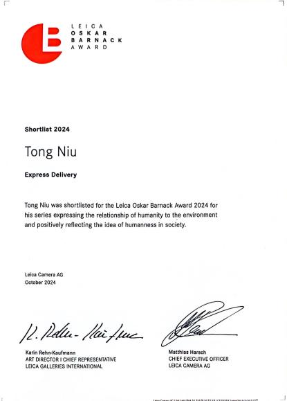 牛童入展2024年徕卡·奥斯卡·巴纳克摄影奖证书,赞扬其作品积极反映“人与环境”这一理念。徕卡画廊国际艺术总监兼首席代表Karin Rehn-Kaufmann与徕卡相机首席执行官Matthias Harsch签名。