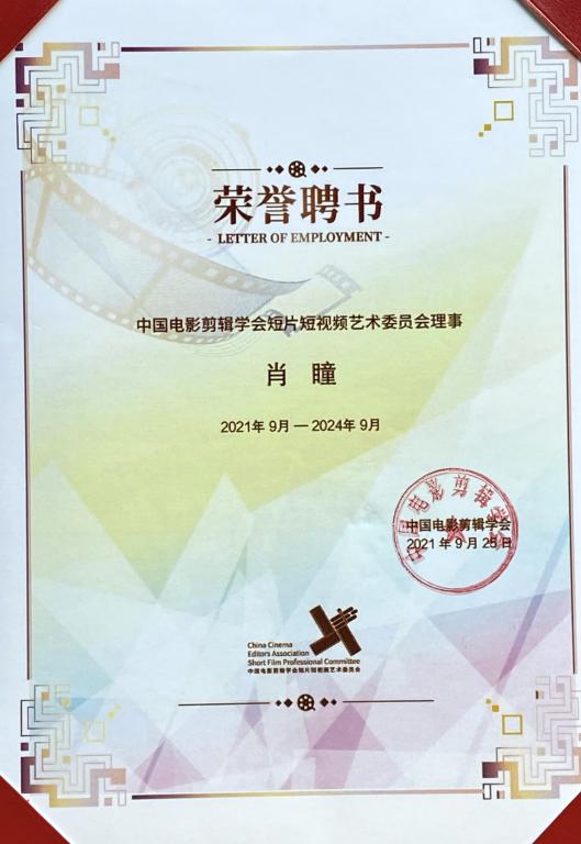中国电影剪辑学会短片短视频艺术委员会理事聘书(第一届)