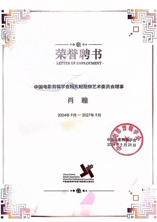 中国电影剪辑学会短片短视频艺术委员会理事聘书(第二届)