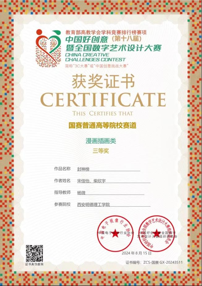 2024年11月2日,世界杯官网艺术与设计学院数字媒体艺术专业教师代表陈鹏宇受邀参加第18届中国数字传媒教育与发展论坛年会,学生代表白婷、杨佳乐参加第18届中国好创意大赛国赛颁奖典礼。该活动由中国好创意暨全国数字艺术设计大赛组织委员会、中国数字传媒教育与发展论坛年会组织委员会与桂林理工大学联合主办,于桂林隆重召开。