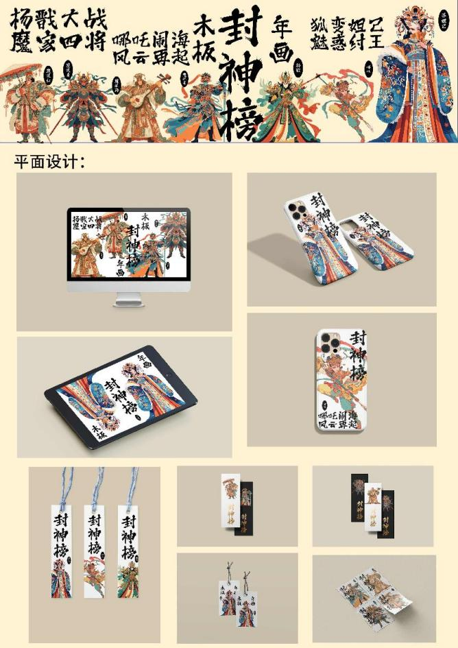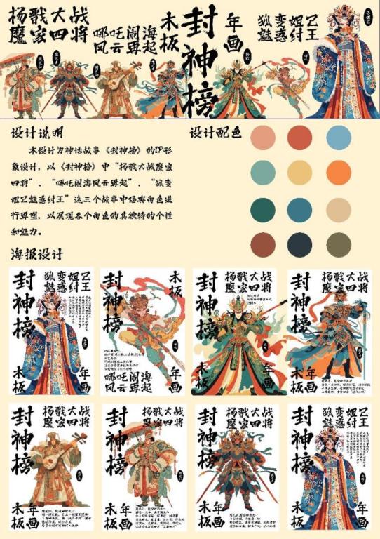 作品说明:本围绕着封神榜来设计创作的,主要涉及了三个故事,第一个是杨戬大战魔家四将;第二个是哪吒闹海,风云再起;第三个是狐变妲己,魅惑君王。设计了杨戬、魔家四将、妲己、哪吒几个人物的设计。每一张设计都以封神榜中描述的人物特点来设计的,比如:穿着、武器、动作,我们还将本次人物设计套样机制作了文创产品。