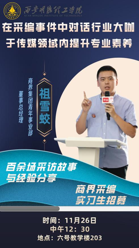 讲座伊始,祖雪蛟凭借自身在商业报道领域深耕多年的丰富阅历,结合商界集团大学生采编实践基地的建立、发展和内容产出情况,联袂高校共同培养适应新时代浪潮的新闻传播人才。他结合切身经验告诉同学们,要勇敢试错、大胆尝试,才能更好的积累经验,做到知行合一,将课堂所学真正用到工作与实践中。