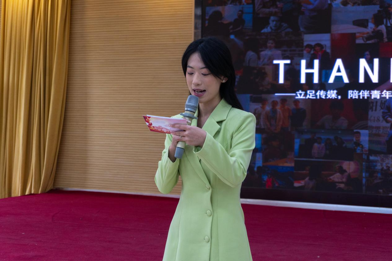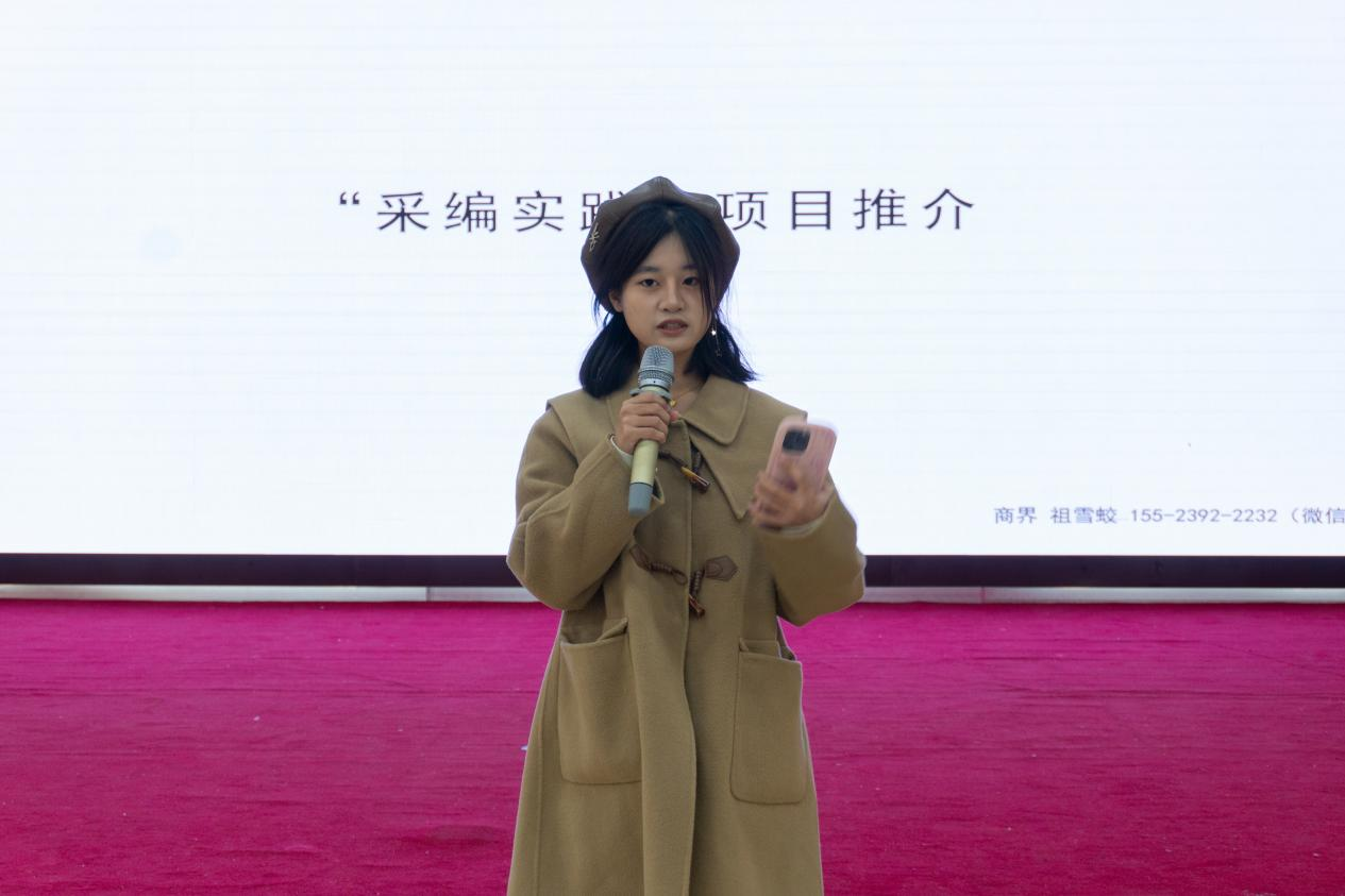 2023级播音与主持专业学生杨馥宁同学分享了自己在商界传媒的实习经验。杨馥宁同学是艺术与设计学院与商界传媒共建实习基地以来的第一批实习生,也是优秀实习生代表,她介绍了如何将个人兴趣与专业实践相结合,在采编活动中历练心态、积累经验、培养能力。