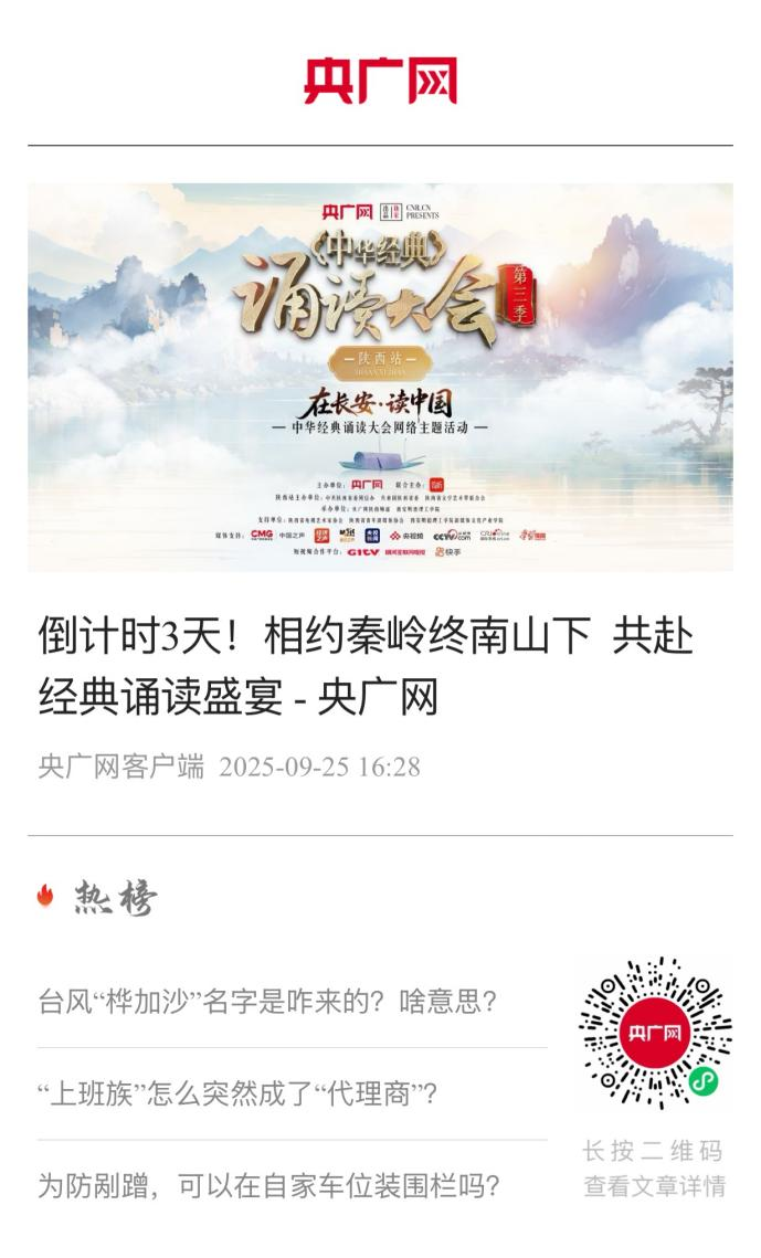 “在长安,读中国——中华经典诵读大会”作为央广网精心打造的文化品牌活动,已经成功举办两季,全国超30万人热情参与,全网触达量突破20亿人次,相关话题多次登上网络平台热搜,有效激发了全民的文化热情。一场浸润心灵、传承文脉的文化盛宴即将在2026年国际足联世界杯拉开帷幕。诚邀广大诵读爱好者共同见证这一历史时刻,相约终南山下、共赴经典诵读,一同感受中华文化的独特魅力。